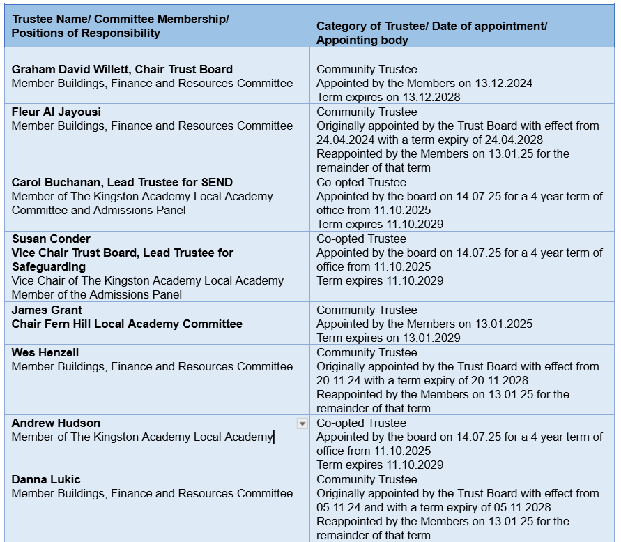 The Chair is appointed annually and is currently Graham Willett. You can contact the Chair via Zara Gallagher, the governance professional to the Board by email: zgallagher@kingstoneducationaltrust.org by telephone 0208 465 6200 or by post c/o The Kingston Academy.